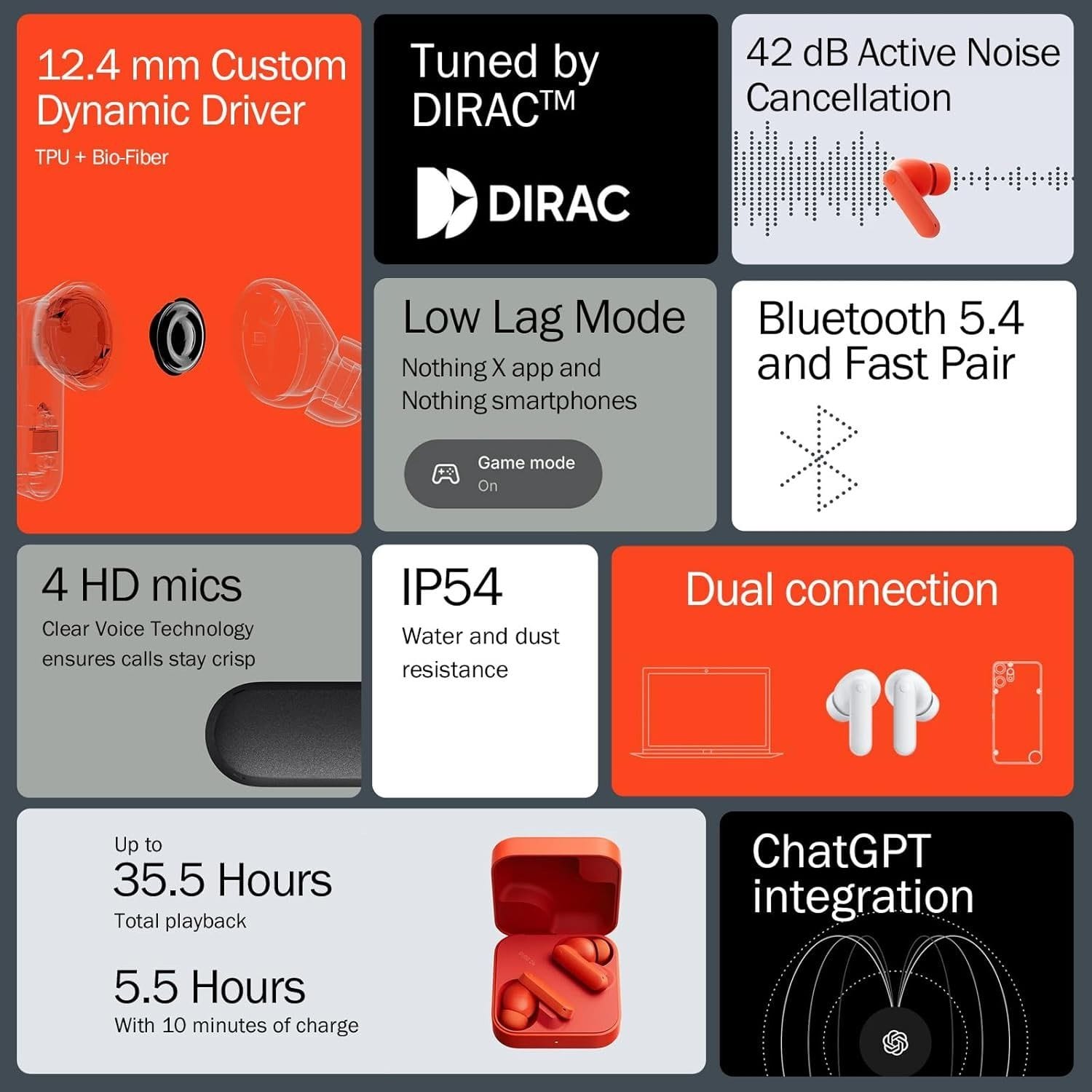 ANC 42 dB • Son LCP 12mm • Application Nothing X • Design Distinctif
