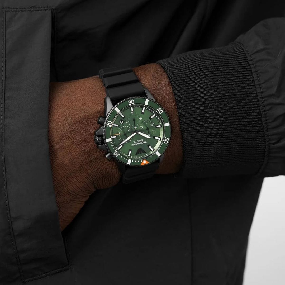 Plus qu’un simple accessoire, cette Diver intègre un chronographe sportif avec trois compteurs précis et un guichet date pratique. Son boîtier en acier inoxydable argenté de 43 mm, associé à une lunette PVD noire graduée, impose une allure masculine et élégante.