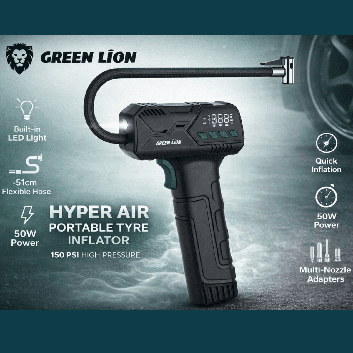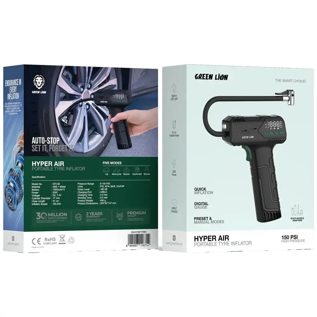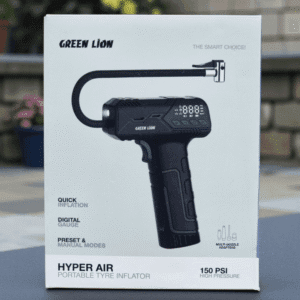 Équipé d’un moteur de 50 W et d’un tuyau de 51 cm, le Green Lion Hyper Air assure un gonflage fluide et rapide, avec un débit d’air de 16 L/min. La plage de pression de 0 à 150 PSI permet une utilisation polyvalente — des pneus de voitures aux pneus de vélos, en passant par les équipements sportifs.