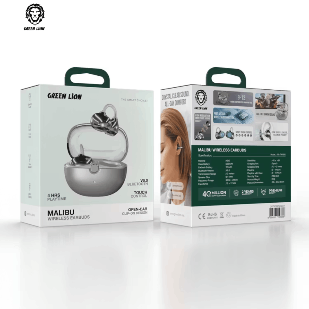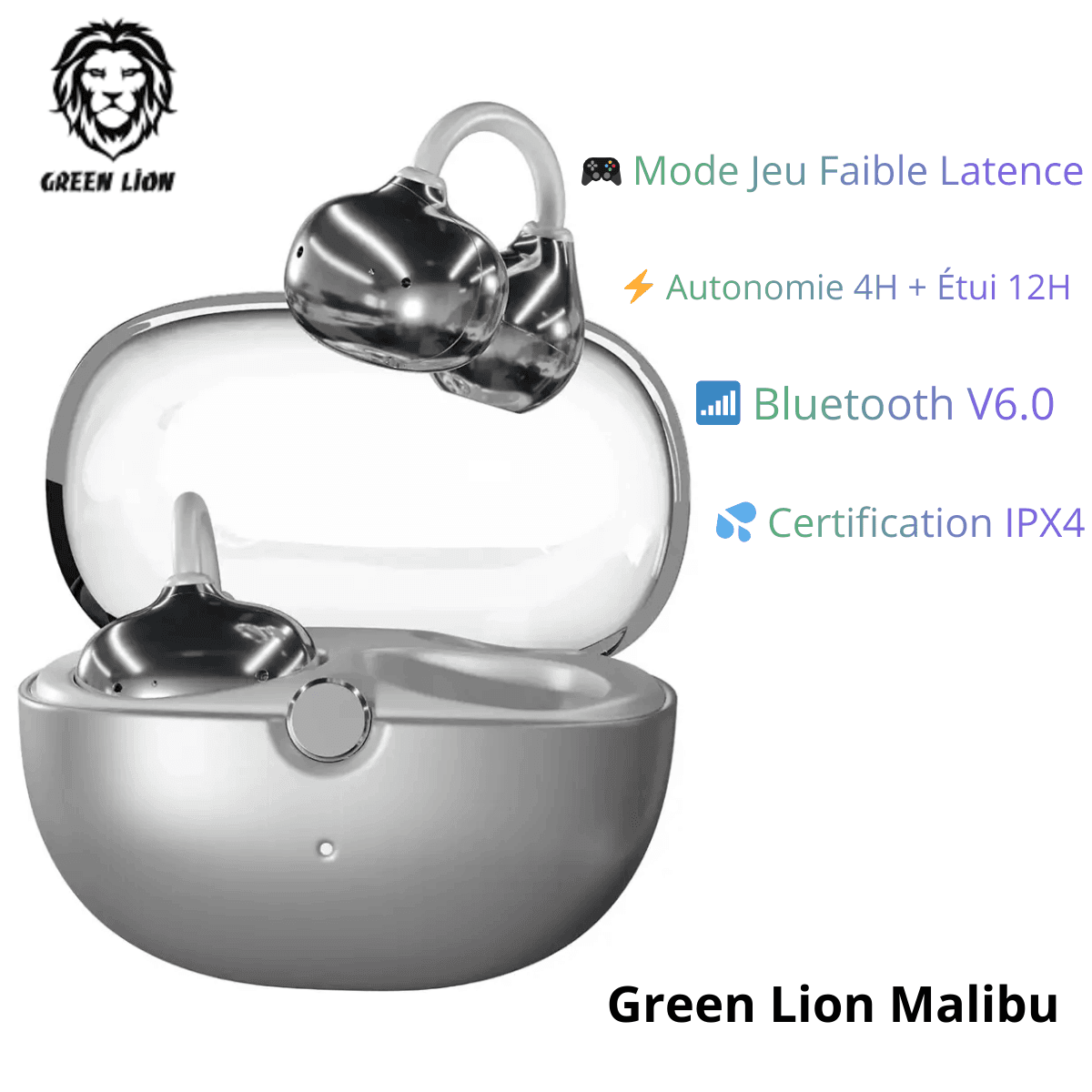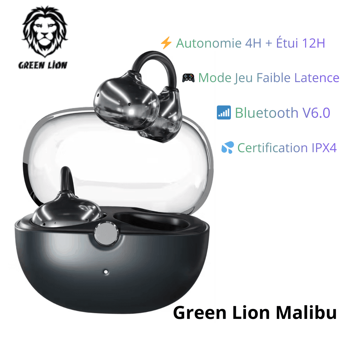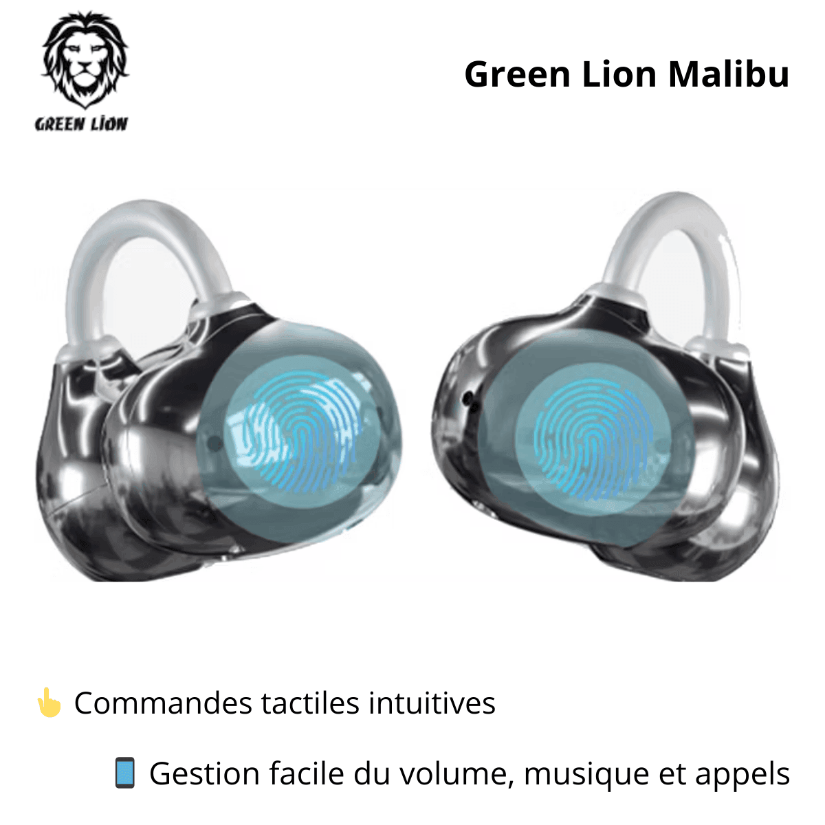 Les Écouteurs Bluetooth sans fil Green Lion Malibu sont conçus pour offrir une expérience audio moderne, confortable et performante. Grâce à leur technologie Bluetooth V6.0, leur haut-parleur dynamique de 11 mm et leur conception open-ear à clip, ils garantissent un son immersif tout en assurant un maintien stable et agréable toute la journée.