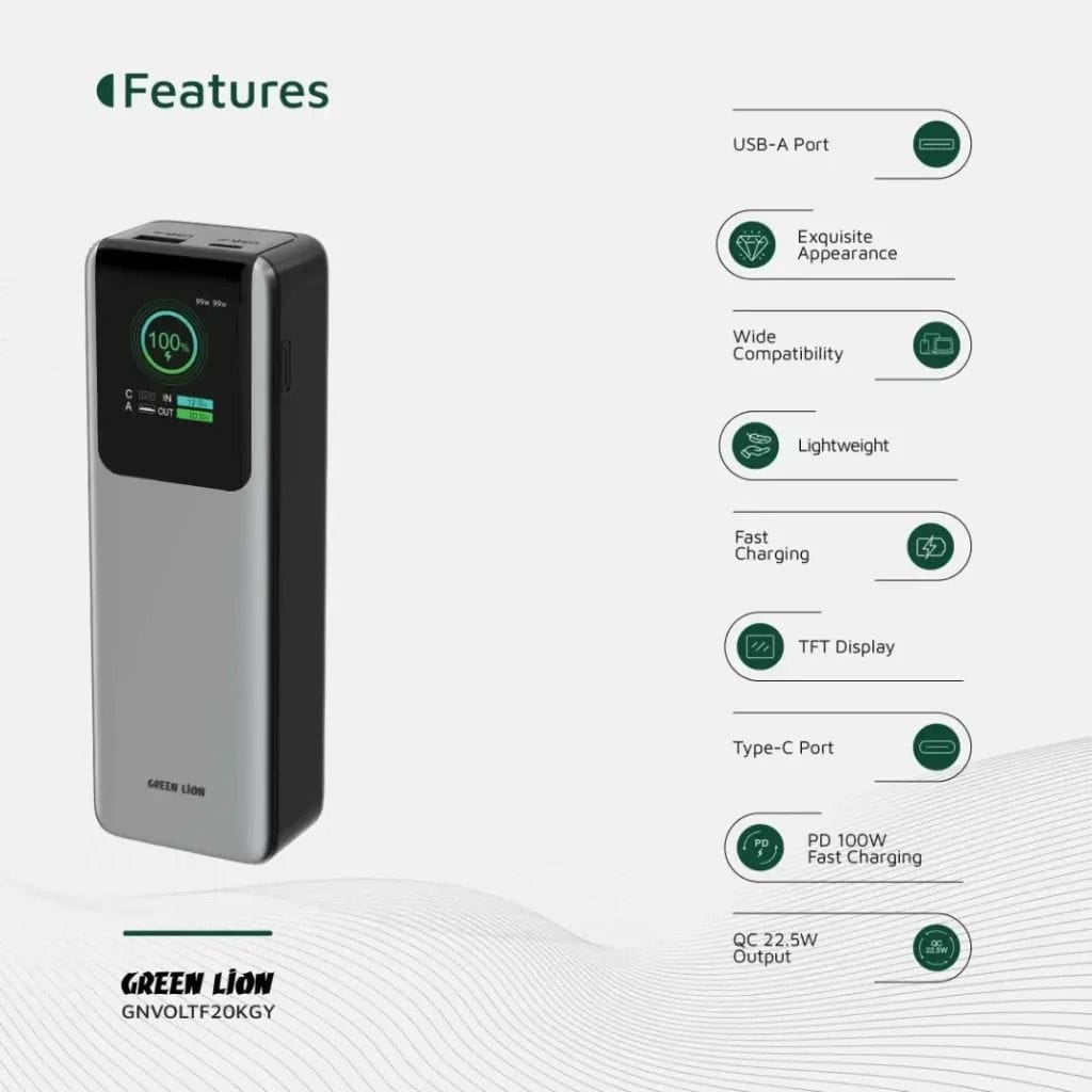 🔋 Green Lion Voltura – Power Bank 20000mAh PD100W Ultra-Rapide