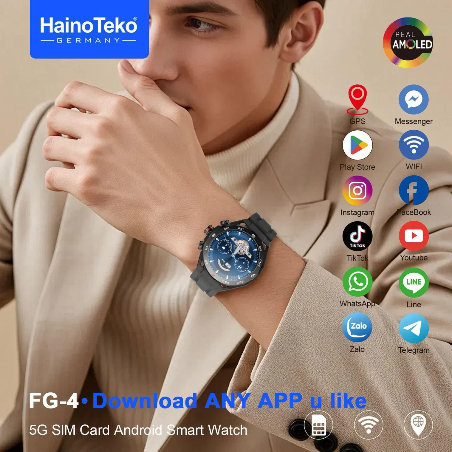 La HainoTeko FG-4 est une smartwatch Android 5G avec carte SIM, conçue pour fonctionner sans smartphone. Grâce à son système Android, son accès au Play Store, sa connexion 5G / Wi-Fi / GPS et son écran AMOLED, elle transforme votre poignet en mini smartphone intelligent.