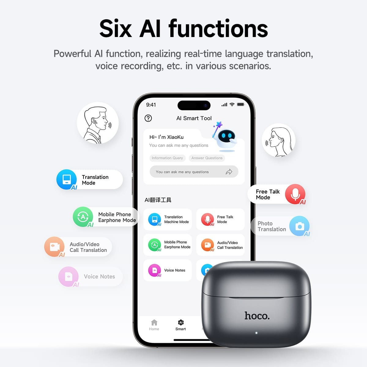 Les Écouteurs Bluetooth HOCO EQ27 AI ne sont pas de simples écouteurs sans fil. Ils intègrent une technologie de traduction instantanée par intelligence artificielle, idéale pour les voyages, le travail et les communications internationales. Un véritable outil intelligent + audio premium dans un seul appareil.