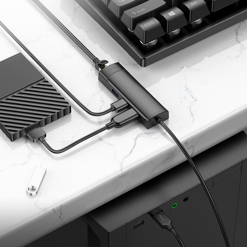 Le HB42 Easy Safety est un hub USB-A qui transforme un seul port USB-A en 3 ports USB supplémentaires et 1 port RJ45, idéal pour connecter plusieurs périphériques simultanément (clavier, souris, disque dur, câble Ethernet, etc.).