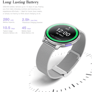 Dotée d’une batterie de 280 mAh, la montre offre jusqu’à 10 jours d’utilisation normale et 44,9 jours en mode économie d’énergie. La charge magnétique rapide permet une recharge complète en moins de 2,5 heures.