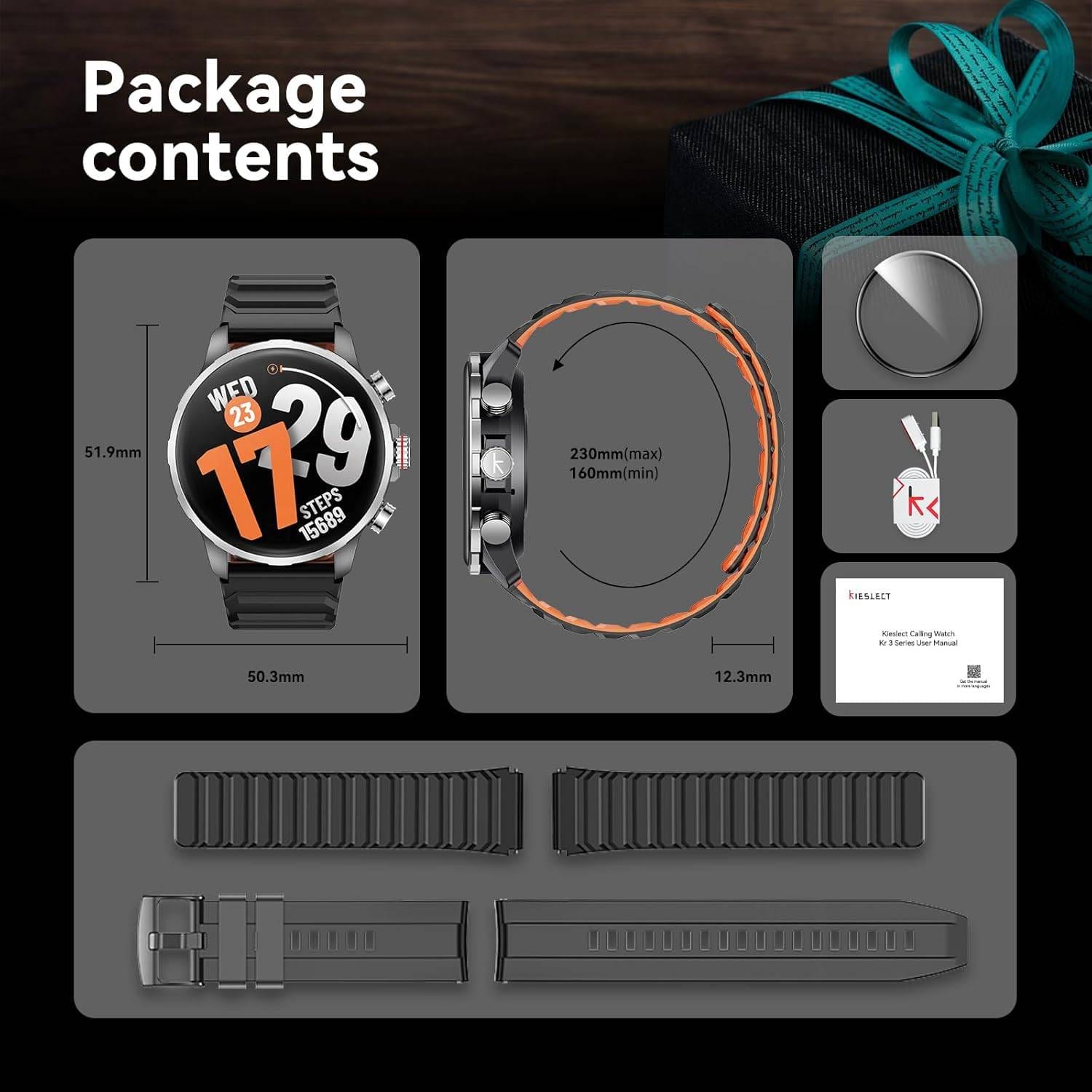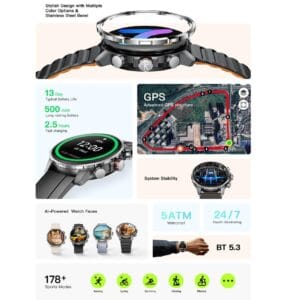 La Smartwatch Kieslect KR 3 séduit par son design robuste et élégant, avec une bordure annulaire en acier inoxydable et un format 47 mm moderne, idéal pour un look sportif et professionnel.