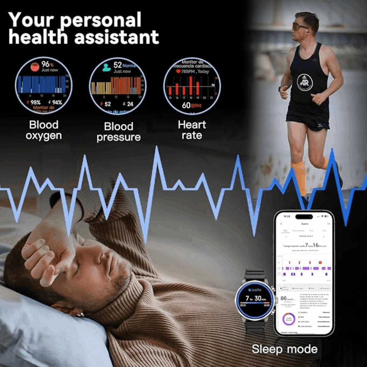 Suivi continu de la fréquence cardiaque, du SpO₂, du niveau de stress, de l’analyse du sommeil et de l’énergie corporelle, pour une meilleure compréhension de ton bien-être quotidien.