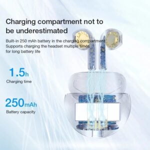 - Capacité de la Baie de Charge : 250 mAh, offrant plusieurs recharges pour vos écouteurs.