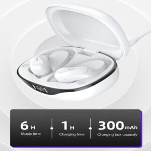 - Chaque écouteur offre environ 6 heures de temps de lecture continue. Le boîtier de chargement de 300 mAh peut recharger complètement les écouteurs environ 5 fois, offrant ainsi une autonomie totale de plus de 30 heures.