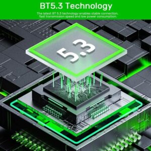 - Technologie Bluetooth V5.3 : Profitez d’une connexion sans fil rapide et stable avec la dernière version Bluetooth 5.3. Compatible avec la plupart des appareils Bluetooth, cette technologie permet une consommation d’énergie réduite pour une utilisation prolongée.