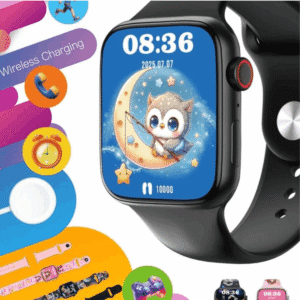La montre est fournie avec un chargeur sans fil, offrant une recharge pratique et rapide, inspirée du système de charge type AirPods pour plus de confort.