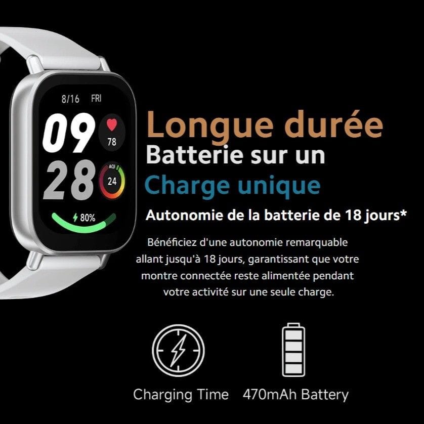 • Batterie 470 mAh – Capacité généreuse pour une montre fine